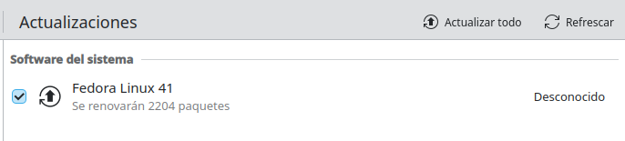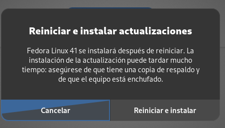 Recuerda tener el sistema actualizado previamente. Si usas Fedora 40 pero tienes actualizaciones de Fedora 40 pendientes de instalar, el sistema te pedirá que las instales antes, se negará a dejarte pasar hasta que las instales y posiblemente reinicies el sistema. La razón por la que pasa esto es porque necesita que dnf esté lo más limpio posible para proceder.